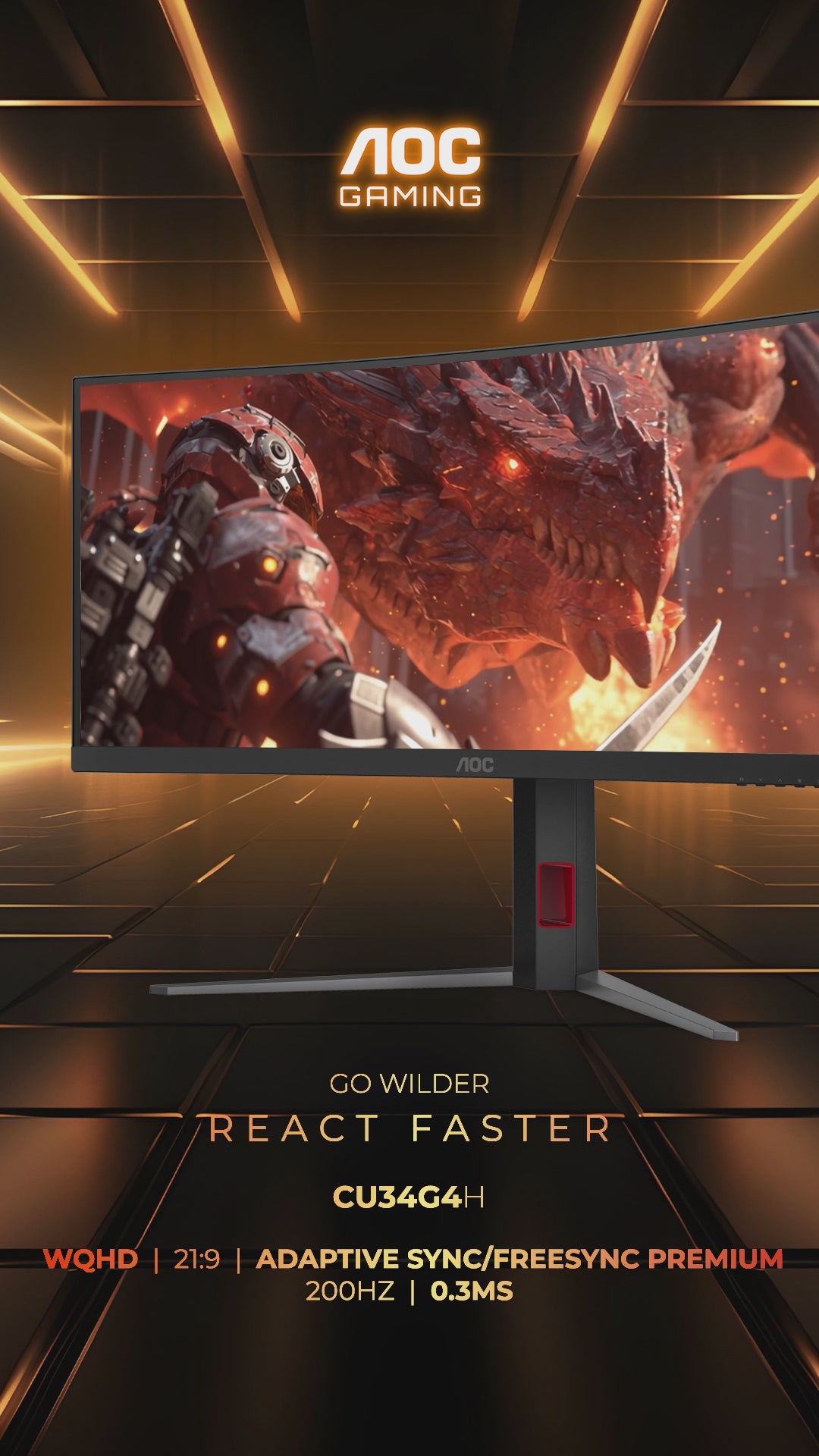 The AOC CU34G4H is a 34-inch ultra-wide curved gaming monitor engineered for immersive gameplay and ultra-smooth competitive performance. Featuring a sharp WQHD 3440 x 1440 resolution, ultra-fast 200Hz refresh rate and lightning-quick 0.3ms response time, it delivers fluid motion and cinematic detail across an expansive curved display.