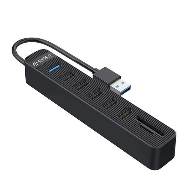 Expand your computer USB ports with the Orico 6-Port USB3.0 HUB with Card Reader for reading SD/TF cards.
